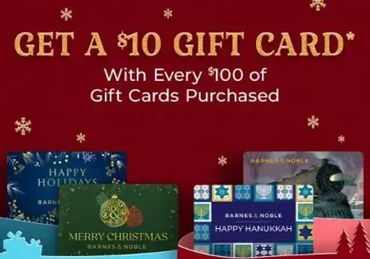 Get a $10.00 Barnes & Noble Gift Card with each purchase of $100.00 or more worth of Barnes & Noble Gift Cards in a single transaction only at Barnes & Noble retail bookstores. This offer is valid only on purchases of Barnes & Noble Gift Cards totaling $100.00 or more in a single transaction only at Barnes & Noble retail bookstores. This promotion starts on October 31, 2025 and expires December 11, 2025 at close of business. The value of your Gift Card purchase must total at least $100.00 to qualify for the $10.00 Barnes & Noble Gift Card reward. Sales tax, gift wrap, shipping and handling charges, processing charges, or any additional charges will not count towards the qualifying $100.00 Barnes & Noble Gift Card purchase amount. Limit of $50.00 Barnes & Noble Gift Card rewards per customer per day. You will receive the $10.00 Barnes & Noble Gift Card reward after making your $100.00 qualifying purchase.